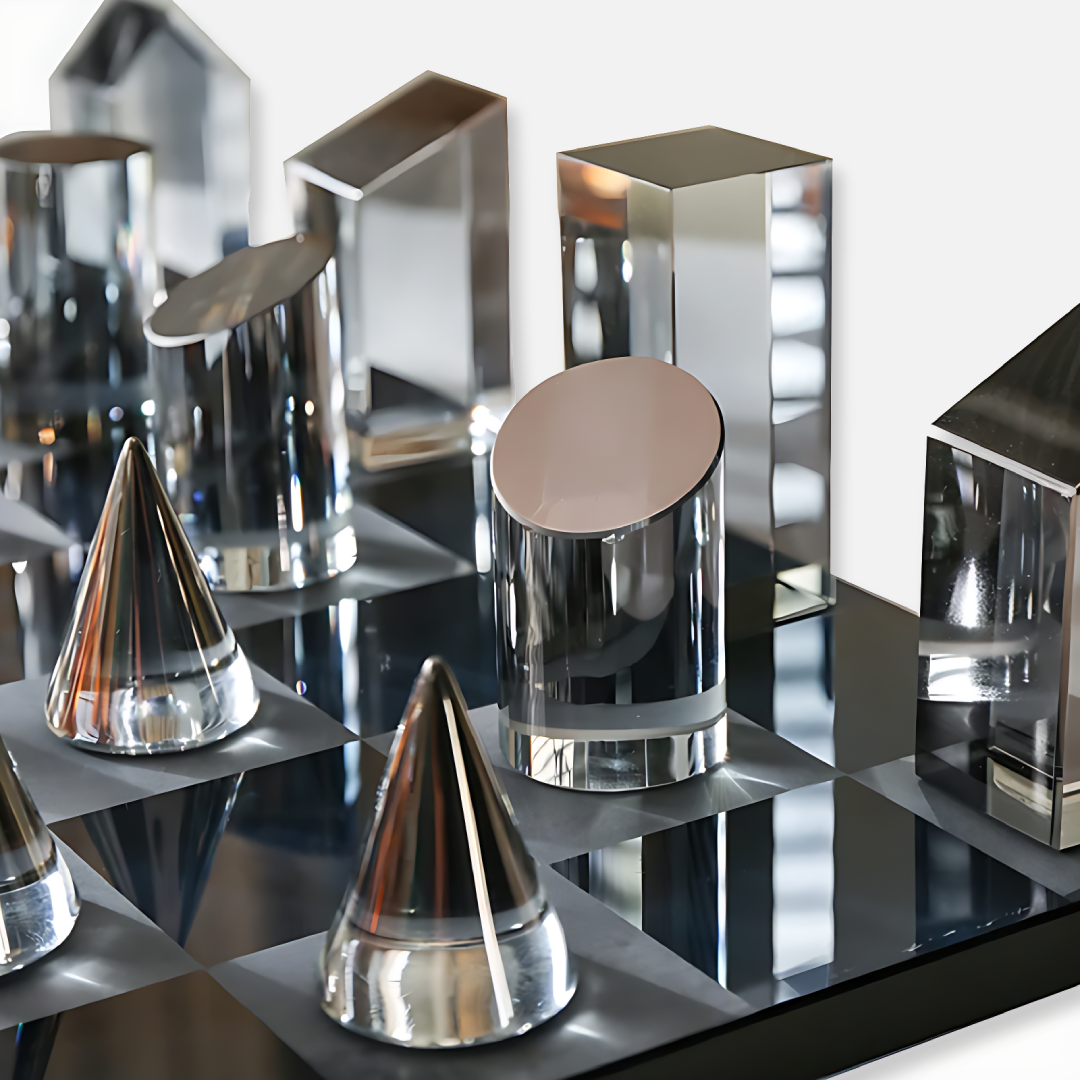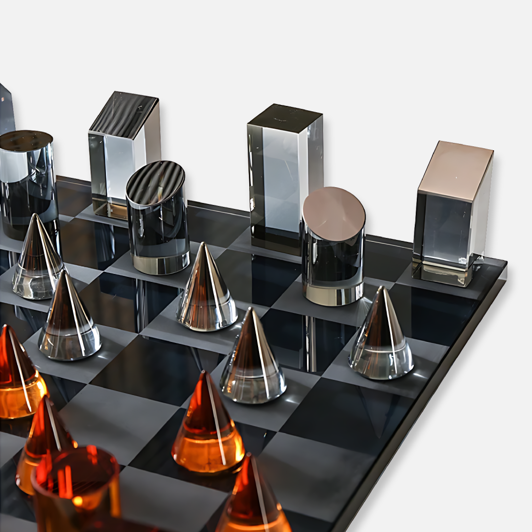 The Vitra Set is a sculptural reimagining of chess, defined by geometric precision and modern clarity. Each piece is cast in smoked and translucent crystal, reflecting stillness, balance, and quiet power with every move.